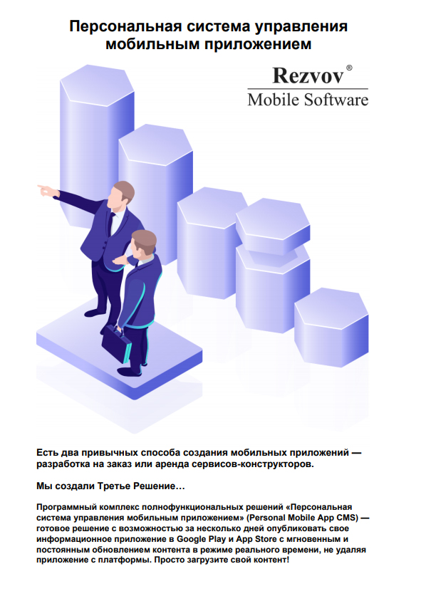Лаборатория мобильных решений «Rezvov Mobile Software» предлагает принципиально новое мировое решение, в котором все ваши данные под полным контролем хранения и использования. Вы сами принимаете решение по выбору и расположению площадки для хранения данных и можете использовать любые доступные методы защиты и резервного копирования информации. «Персональная система управления мобильным приложением» — принадлежит только Вам!