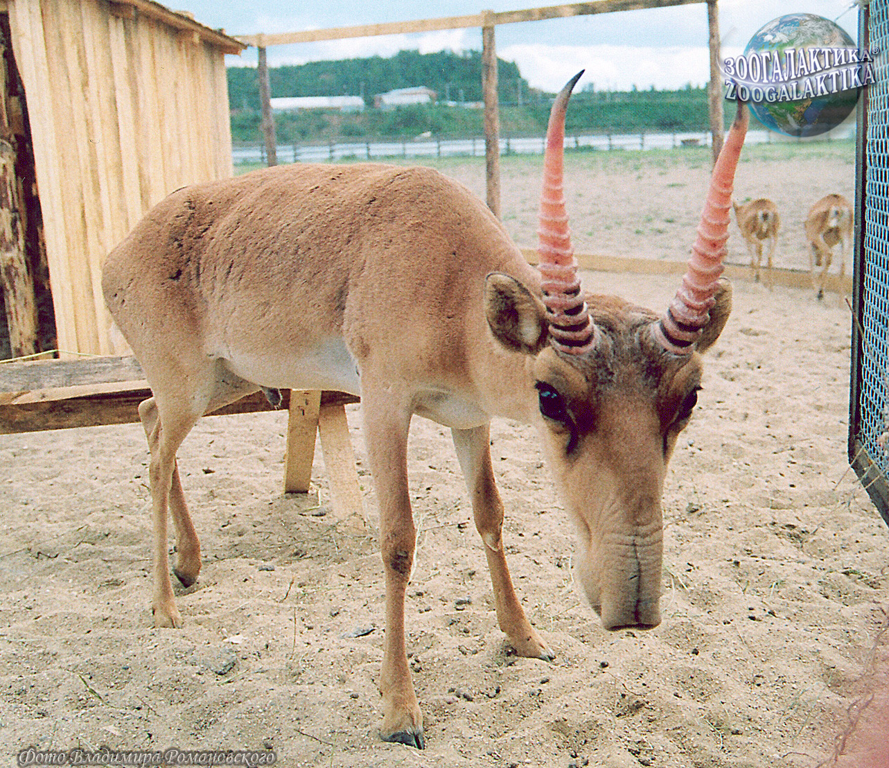 Сайгак - небольшая антилопа, длиной тела до 150 см, высотой до 80 см и весом 23-40 кг. Телосложение у нее легкое, но несколько неуклюжее: удлиненное тело, тонкие, сравнительно короткие, но сильные ноги. Особенно своеобразный облик сайгаку придает большая горбоносая голова с мягким подвижным хоботком, нависающим над ртом. Эта горбоносость возникает из-за чрезвычайного увеличения носовых полостей, в которых согревается холодный воздух, вдыхаемый сайгаками во время быстрого бега зимой. Густой длинный мех, который отрастает к зиме, защищает сайгаков от свирепых буранов, а волосы, покрывающие их морду, как у северных оленей, предохраняют от охлаждения нос.