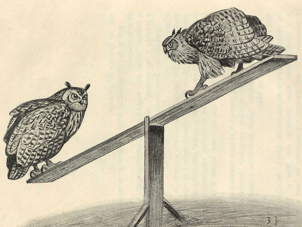 С большим трудом вызвал я у птицы желание двигаться по длинной доске, стоящей на козлах. Поощрением его вкусовых слабостей – приманкой я закрепил это движение, то есть заставил запомнить его. При этом мой филин как-то важно, выставив грудь вперед и подняв голову, расхаживал по доске, точь-в-точь старый профессор на лекции. Так я его и прозвал «профессором».