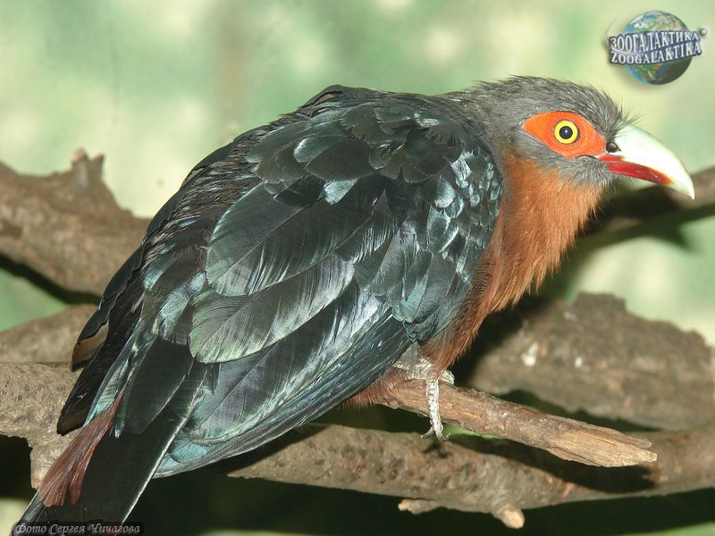 Достаточно крупная древесная птица с большим загнутым клювом, короткими крыльями и очень длинным хвостом. Общая длина взрослой особи варьирует от 42 до 49 см, вес около 122 г. В глаза в первую очередь бросается ярко-красное кольцо морщинистой кожи вокруг глаз, граничащее с такой же красной нижней частью клюва (подклювьем). Верхняя часть клюва (надклювье) жёлтое либо рогового цвета. Оперение головы серое с белыми узкими надбровными полосками. Остальной верх блестящий тёмно-зелёный, с возрастом приобретает синий оттенок. Верхняя половина хвоста зелёная, нижняя винно-красного цвета без белой окантовки. Горло, грудь и брюхо каштаново-коричневые. У молодых птиц неоперённая область вокруг глаз занимает меньшую площадь, большая часть подклювья чёрная. Половой диморфизм проявляется лишь в окраске радужной оболочки: у самцов она голубая, у самок жёлтая.