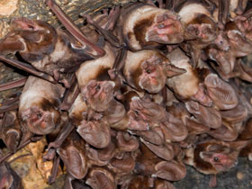 Хотя особи некоторых видов рукокрылых держатся поодиночке, в большинстве своем это общественные существа, живущие колониями, в которых бывает от нескольких до многих тысяч зверьков. Отдыхают почти все летучие мыши вниз головой, подвешиваясь к опоре при помощи когтей задних ног и образуя при этом плотные гроздевидные скопления. Вероятно, такая скученность полезна с точки зрения терморегуляции, поскольку снижает колебания температуры. В колониях постоянно поддерживаются высокие температуры (до 55°C), ускоряющие рост детенышей. В отсутствие детенышей тело отдыхающих рукокрылых обычно остывает почти до температуры окружающей среды (дневное оцепенение). Похоже, что такой механизм экономии энергозатрат - один из факторов, способствующих поразительной долговечности этих мелких млекопитающих, которые доживают до 30-летнего возраста. Если температура в районе обитания рукокрылых падает зимой ниже нуля, они либо впадают в спячку в пещерах или других защищенных местах, либо мигрируют в более теплые места. Спячка напоминает глубокий сон, при котором сердцебиение едва заметно, а дыхание замедляется до одного вдоха-выдоха за 5 мин. У активного зверька температура тела составляет 37-40° C, во время спячки же она опускается до 5°C. Мигрирующие летучие мыши обычно пролетают расстояния более 300 км. Бразильский складчатогуб может преодолевать почти 1600 км, направляясь с юго-запада США на "зимние квартиры" в Мексике.