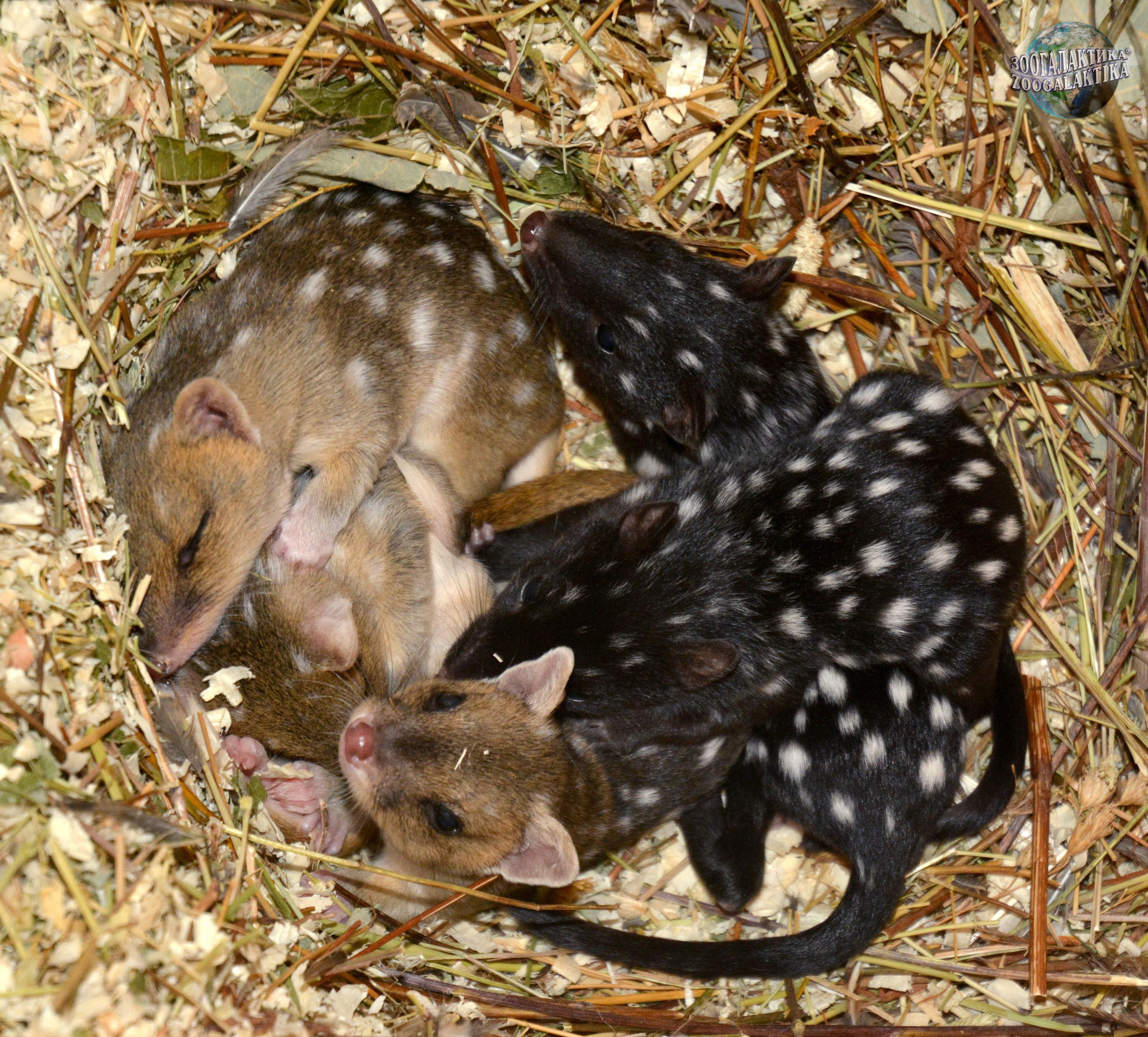 Несколько лет назад сотрудники Московского зоопарка были в Лейпциге, и им настолько понравились эти симпатичные сумчатые, что они стали выяснять, нельзя ли Московскому зоопарку получить их. И вот в июне 2015 года в Московский зоопарк приехали сразу шесть крапчатых сумчатых куниц - два самца и четыре самки. Через некоторое время было зафиксировано спаривание. Этот процесс у пятнистых сумчатых куниц настолько необычен, что его трудно оставить без внимания. В природе это происходит так. Самка оставляет за собой пахучий след, по которому ее разыскивает самец. Он начинает преследовать ее, до тех пор, пока она не поднимет лапу и даст возможность самцу тщательно обнюхать ее, давая сигнал тем самым о готовности к спариванию. Во время спаривания самец запрыгивает на спину самки, вцепляясь в ее шею. Делает он это так сильно, что у самки шея сильно опухает и остается голый участок кожи (для австралийских коллег он потом служит признаком успешной случки). Самое удивительное, что половой акт у этих сумчатых может длиться до 24 часов. Иногда самцы столь агрессивно подходят к спариванию, что убивают свою партнершу. Если же самка не сразу согласится совокупляться, самец убивает ее практически немедленно. Самцы же буквально до смерти изнуряют себя попытками произвести как можно больше спариваний. Весь сезон размножения они дерутся с конкурентами, мало едят и почти не спят. В итоге к концу года популяция пятнистых сумчатых куниц может вообще состоять из одних лишь самок и их детенышей.