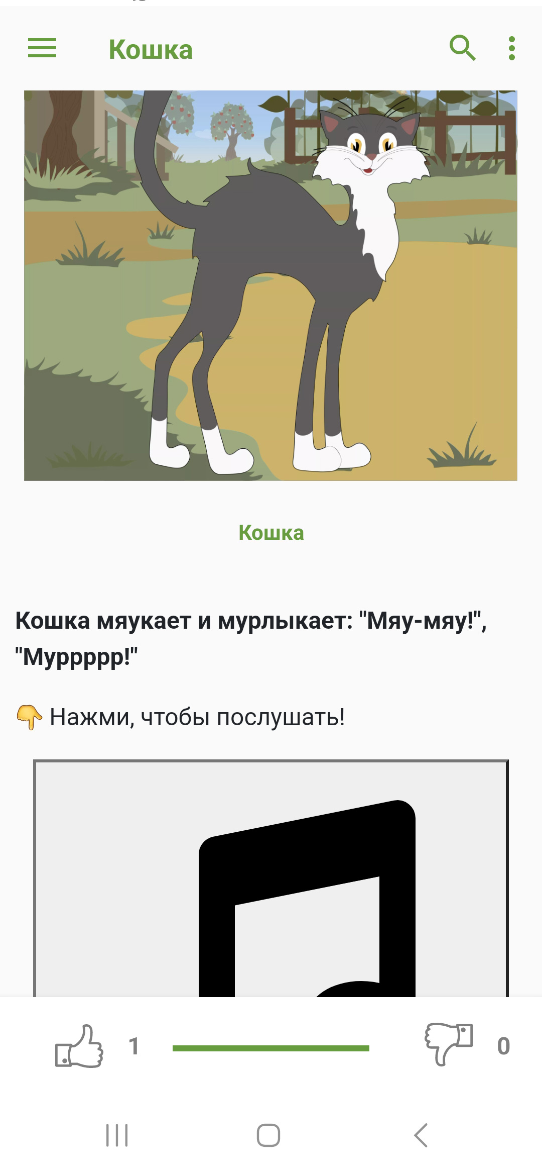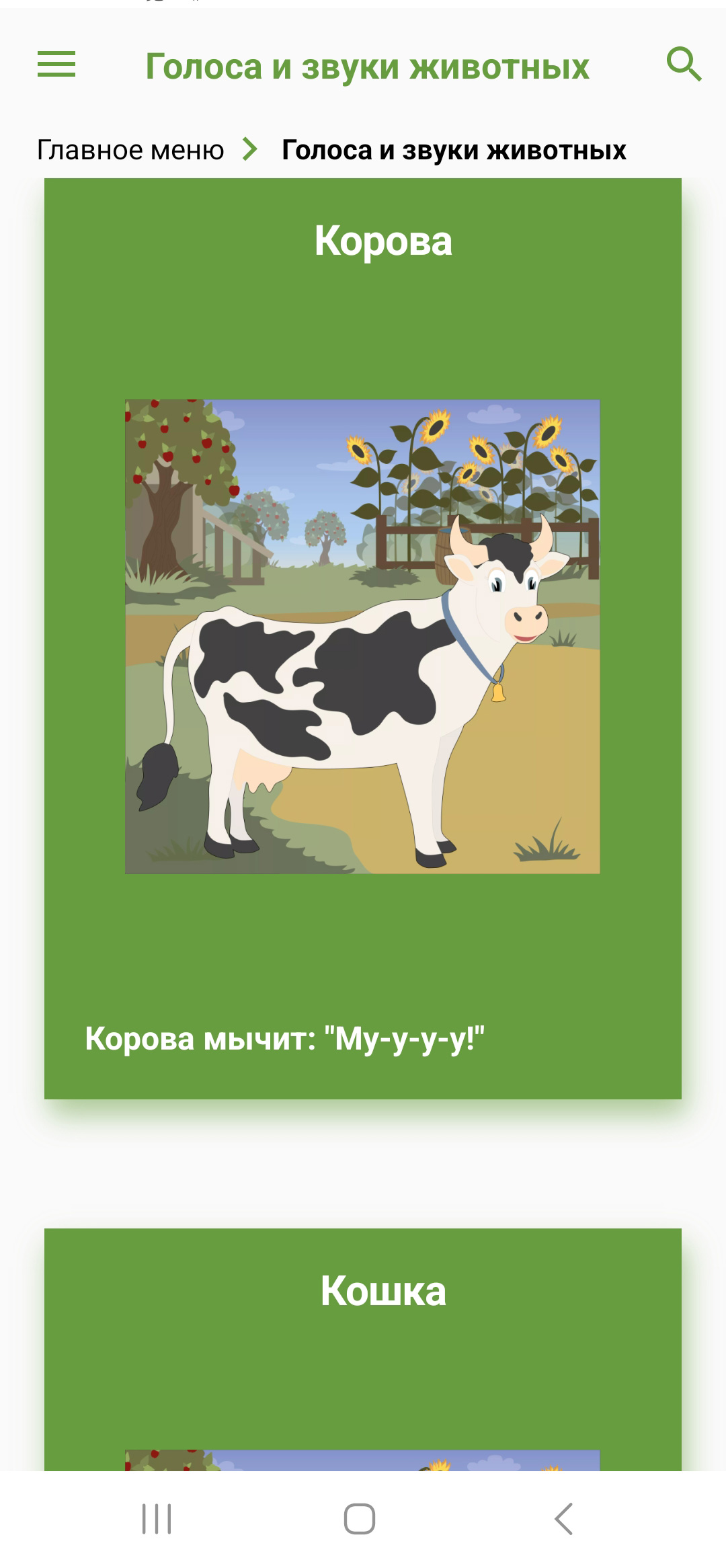 В приложении ребенок может услышать как "разговаривают" такие животные как волк, тигр, лев, кошка, собака, корова, коза, лошадь, лягушка, крокодил, слон и многие другие.